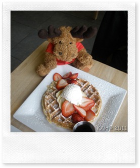 There are a million different kinds of waffles to choose from. Well, OK, maybe not a million, but there’s a lot! One has ice cream and strawberries and nuts and chocolate syrup and whippy cream! That’s better than a Moose Munch Bar! I bet Sleepy Bear would order that one if he was here with me.